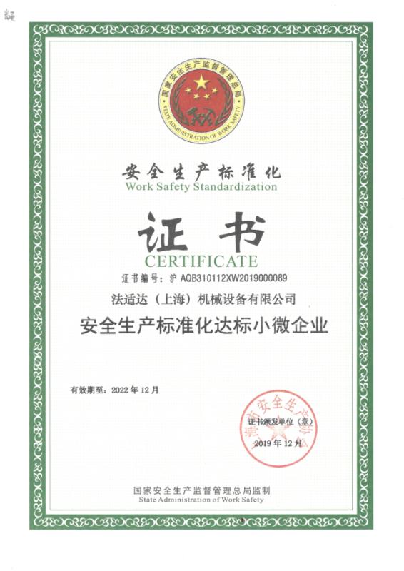 法适达通过安全标准化认定,拿到上海市安全协会颁发的证书。