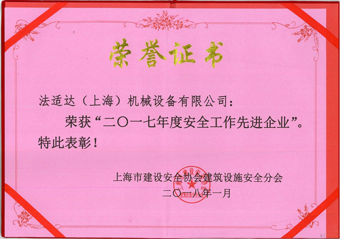 法适达荣获由上海市建设安全协会建筑设施安全分会颁发的“2017年度安全工作先进企业”。